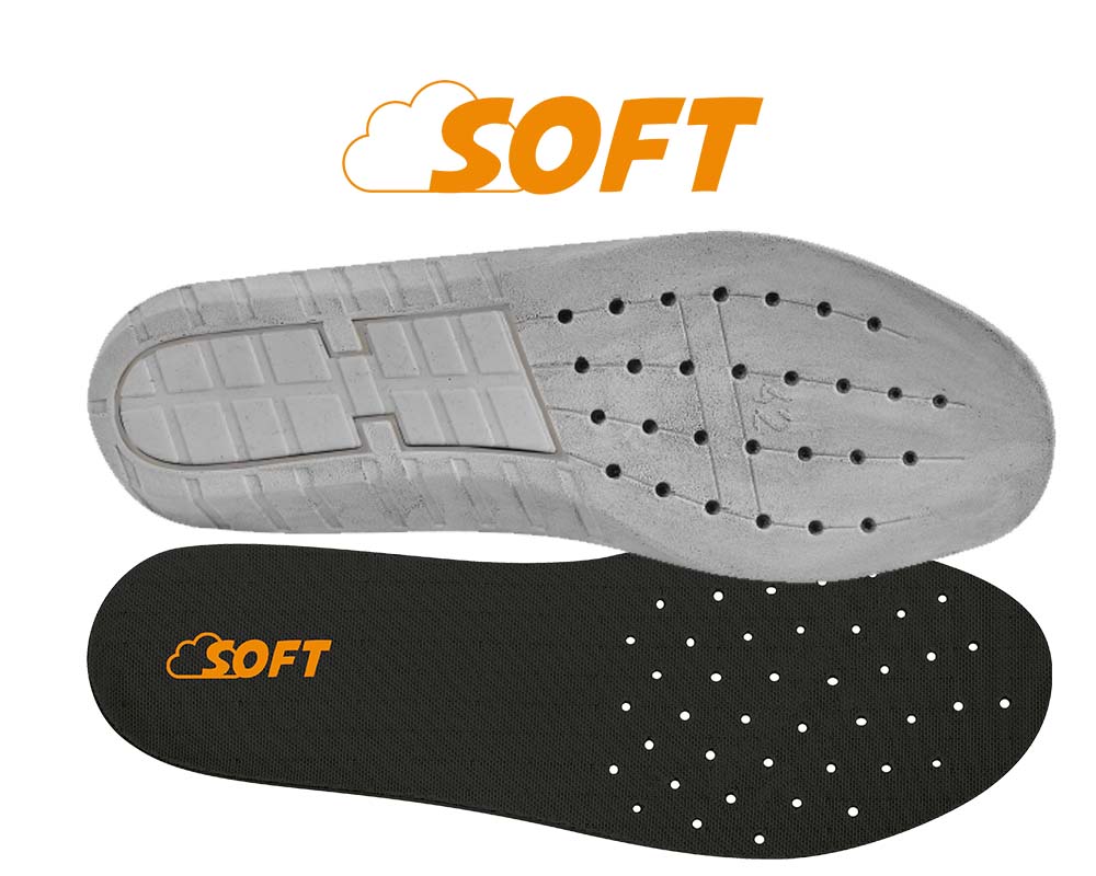 SOFT, direct onder de voetzool, verbetert de gewichtsverdeling door drukpunten en ongemak te verminderen.