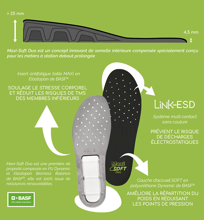 MAXI-Soft Duo™ est un concept innovant de semelle intérieure compensée, spécialement conçu pour les postes à station debout prolongée.